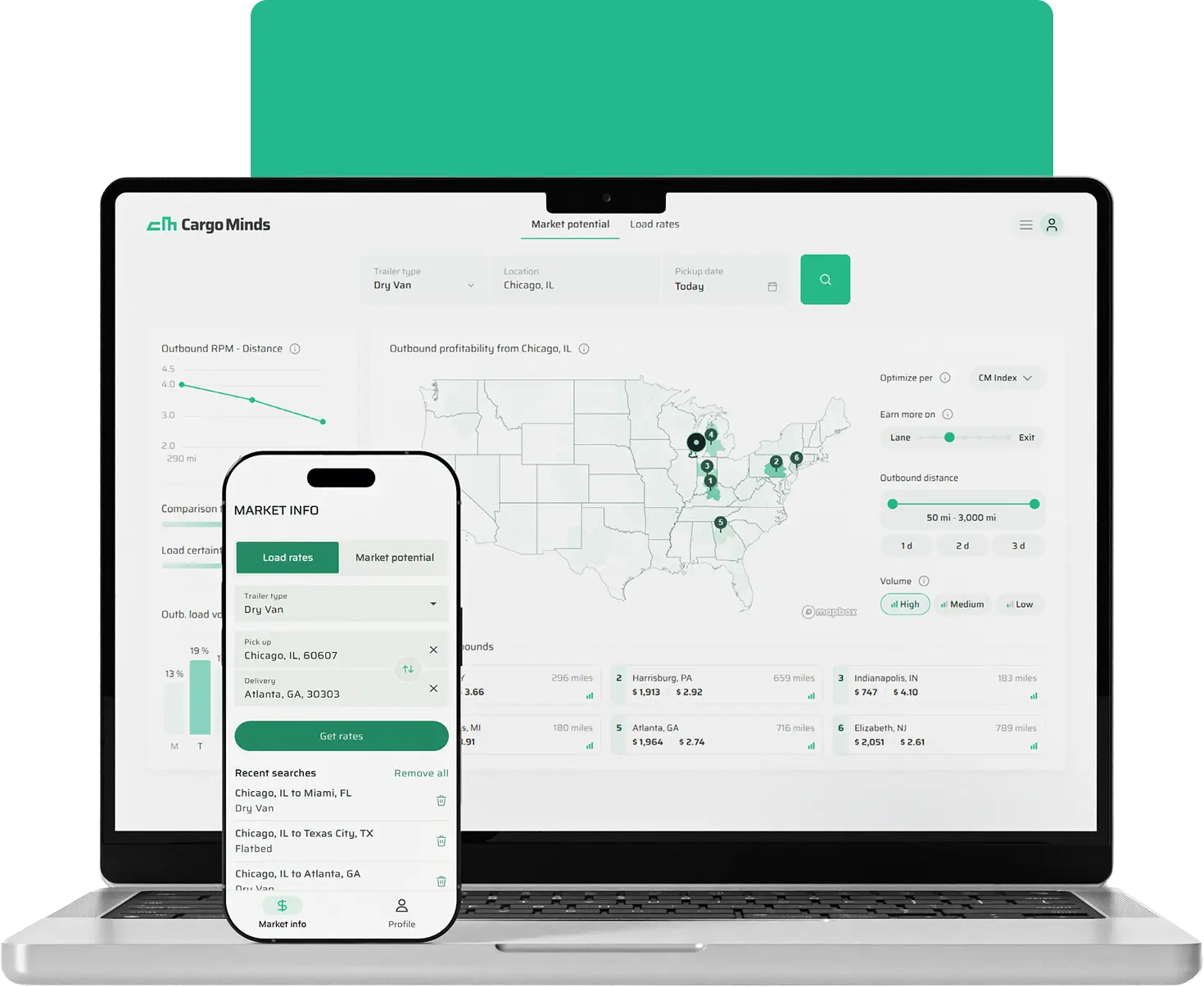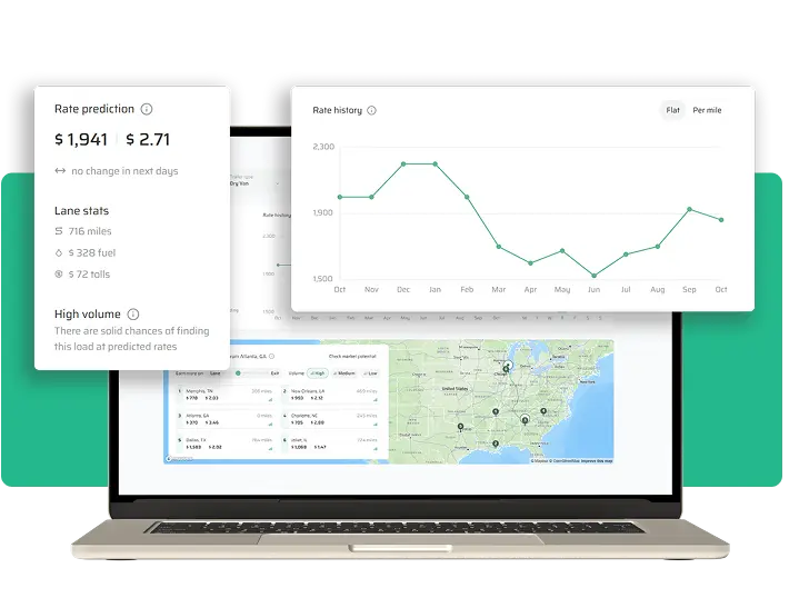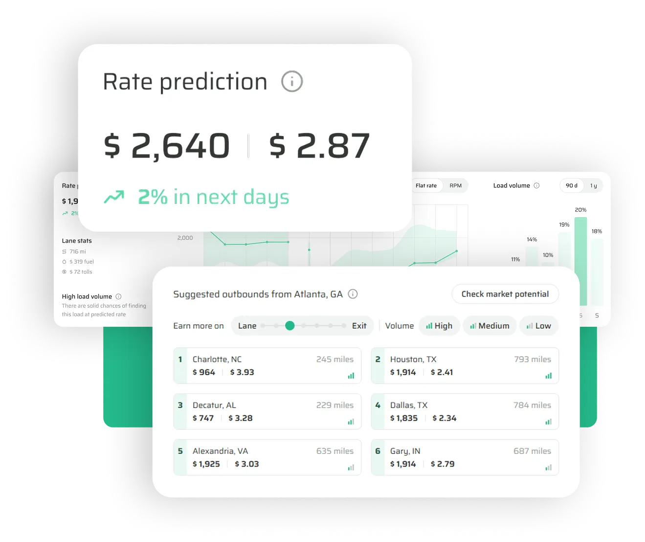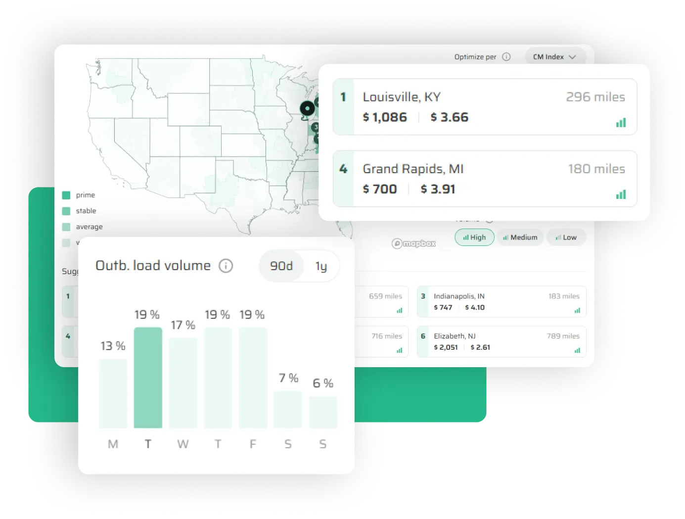 See the most profitable lanes from your truck’s location, identify the strongest U.S. regions, and get accurate load volume data to dispatch smarter.