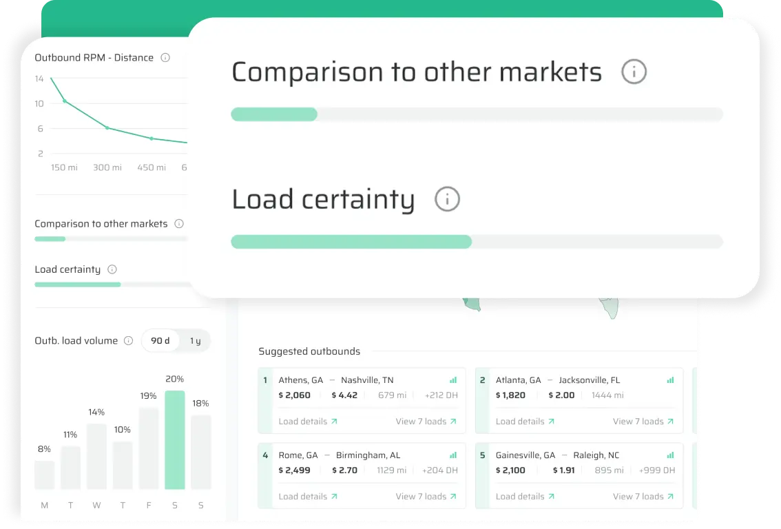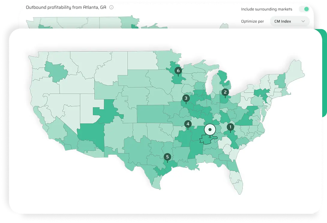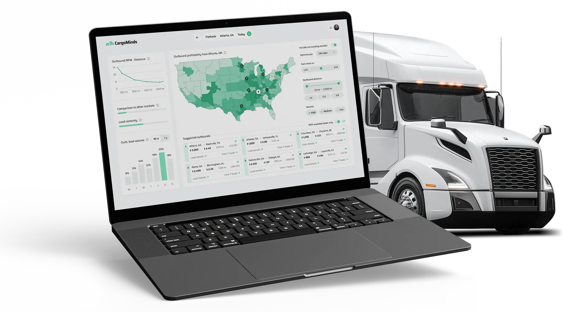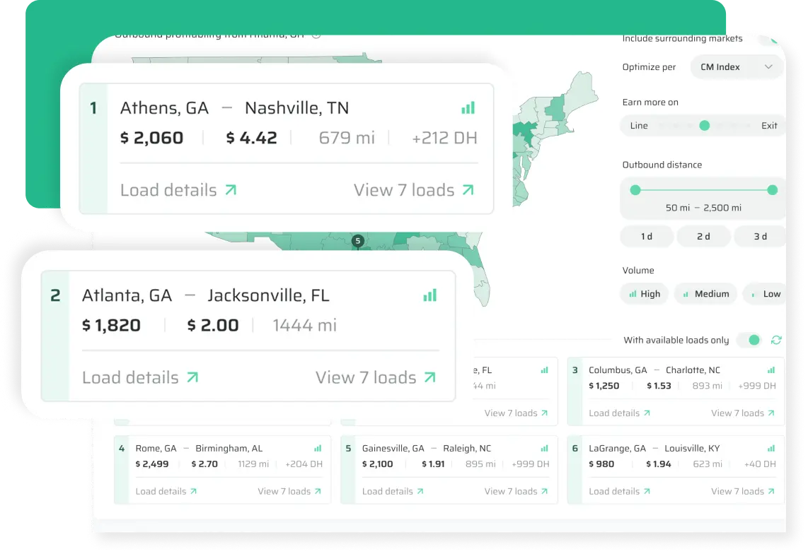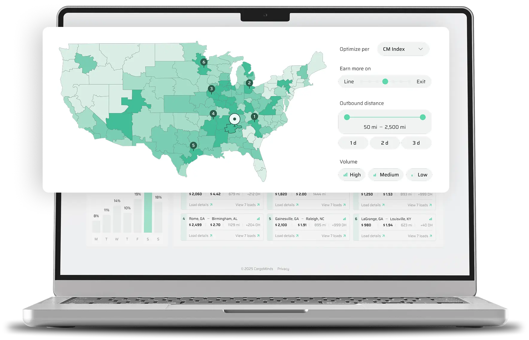Get smart load suggestions based on your truck’s current location and each destination’s outbound potential. With CargoMinds, you’re always guided toward the most profitable lanes.