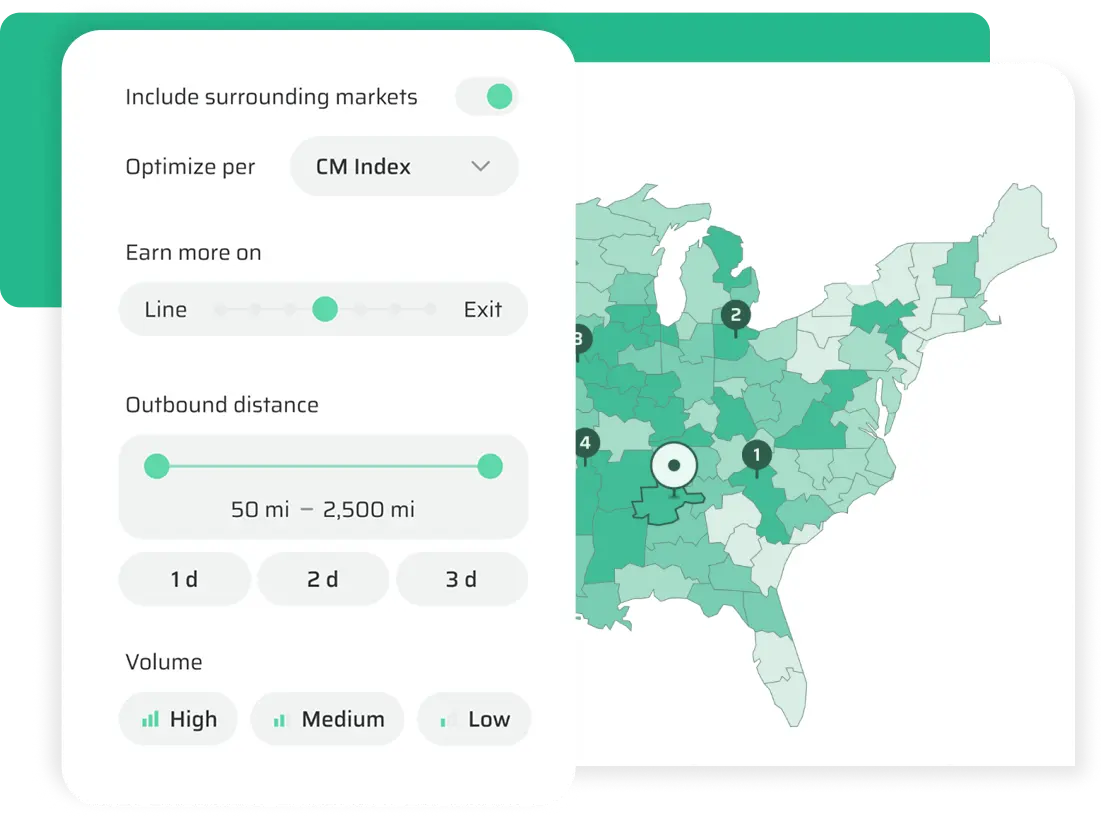 Easily spot the most active freight areas across the country and plan your lanes to keep your trucks moving and earning, without unnecessary deadhead miles.